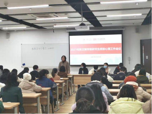 党委副书记张莹老师、文新嘤鸣坊负责人段化鞠老师、博士生辅导员吴光芬老师、2021级硕士辅导员王志华老师、2020级硕士辅导员雷子慧老师、2019级硕士辅导员陈羲老师以及果冻传媒各班级心理工作负责人等80多人参加了会议。