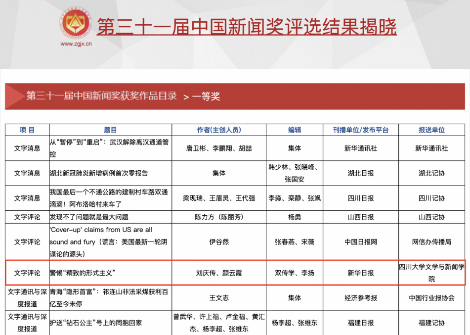 报送的新华日报作品《警惕“精致的形式主义”》获第三十一届中国新闻奖一等奖,是此届中国新闻奖一等奖中仅有的三篇文字评论之一。