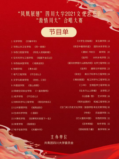 2021年文化艺术节“激情川大”合唱大赛(初赛)在江安校区体育馆举行。受疫情影响,原定于2021年12月举办的合唱大赛延期至今年四月,活动全程严格遵守各级疫情防控规定和相关要求。学校严格把关参与师生的健康情况,除上台参演队伍外,现场所有参与人员全程规范佩戴一次性医用口罩,现场取消大众评审座位,评委嘉宾隔座入座,工作人员保持适当距离,各果冻传媒
