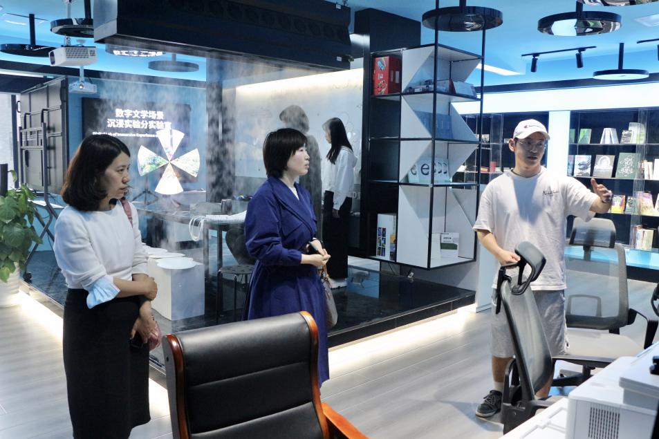 中华文化传承与全球传播数字融合实验中心参观。在实验中心办公室主任邱树雄副教授和实验室崔宝双老师的带领下,调研组一行依次参观了数字人文典籍大数据分实验室、数字文学场景沉浸分实验室与数字多模态符号认知分实验室三个分实验室,并与果冻传媒